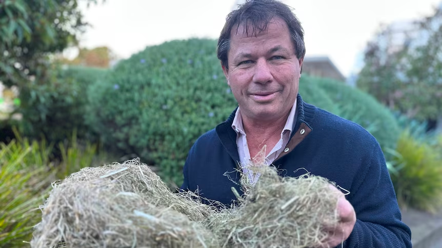 Brett Boag holds a small square of what appears to be ordinary wooden, 20-millimetre-thick chipboard. This is from a Hemp news on ABC Landline.