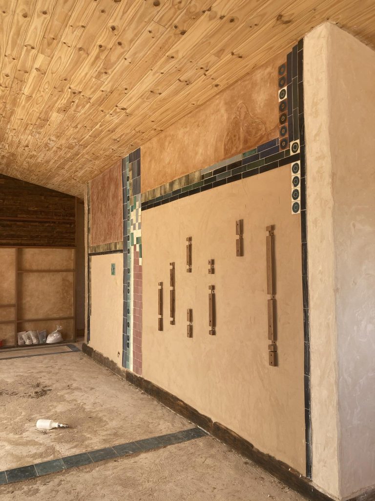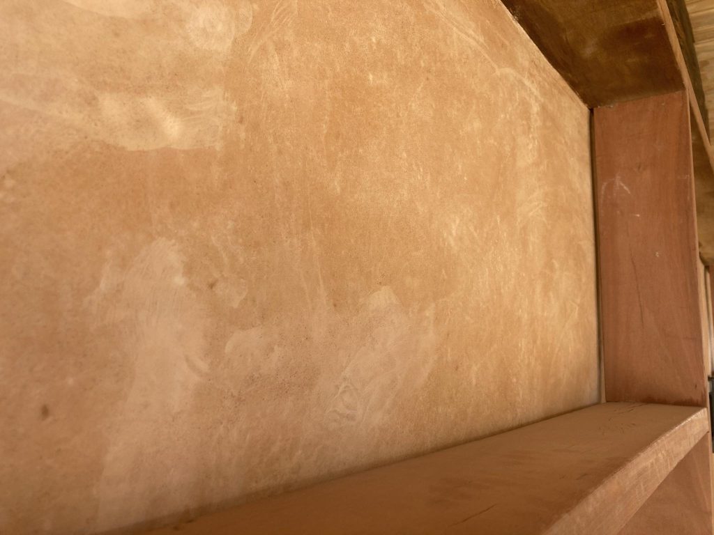 I learned the art of Tadelakt render through New Age Artisans in Montana who kindly taught me. I built a limecrete bath and Cocciopesto (a natural waterproof lime-based material used since Roman times) vanity for our existing bathroom to practice for our new house. I rendered Tadelakt on all of our existing bathroom walls including the shower. It was then that Gene started falling in love with those beautiful old building methods.