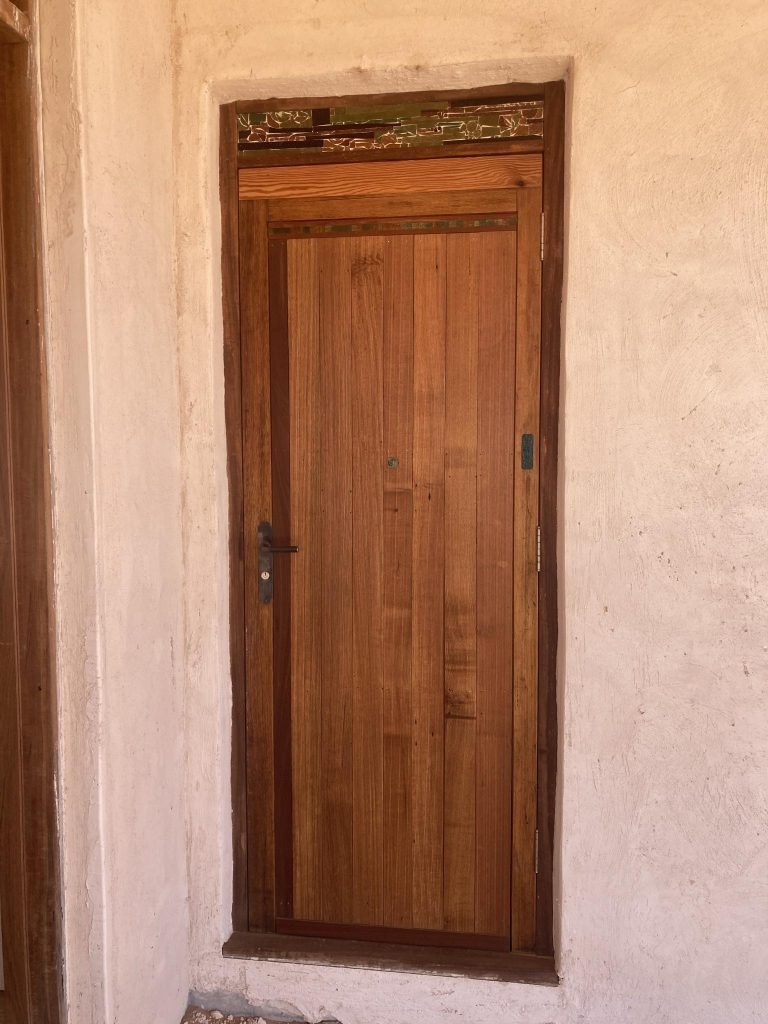 I have just finished installing the windows and doors which I made on site in my wood workshop. For the frames I used old Oregan which came from the Castlemaine flour mill which had burned down at some stage. The massive timber logs were all charred on the outside but perfect still on the inside. I cut out all knots and cracks out of the timber and fixed many of the pieces of timber for the window frames and purposefully used different coloured timbers and stained glass to fix and decorate the frames. It took about 4 months to build the frames. The casement for the windows I made out of new Western Red Cedar timber that I had purchased from Hazelwood and Hill Timber. It took me another 6 or so weeks to make and fit and hinge them.